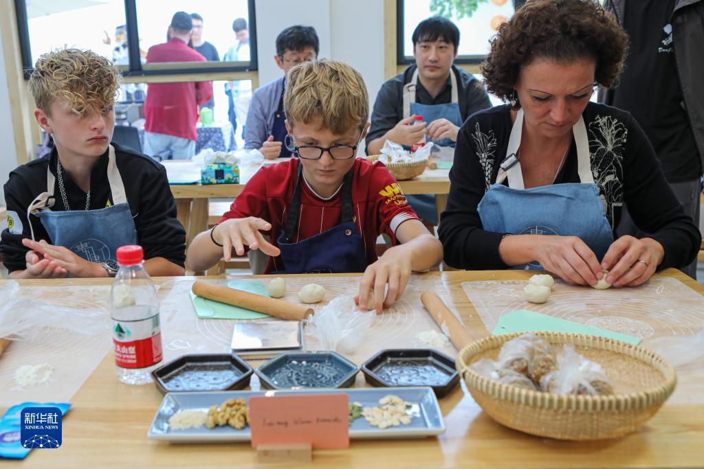 9月24日,在婁塘塌餅非遺傳承館,外國友人體驗製作月餅。
