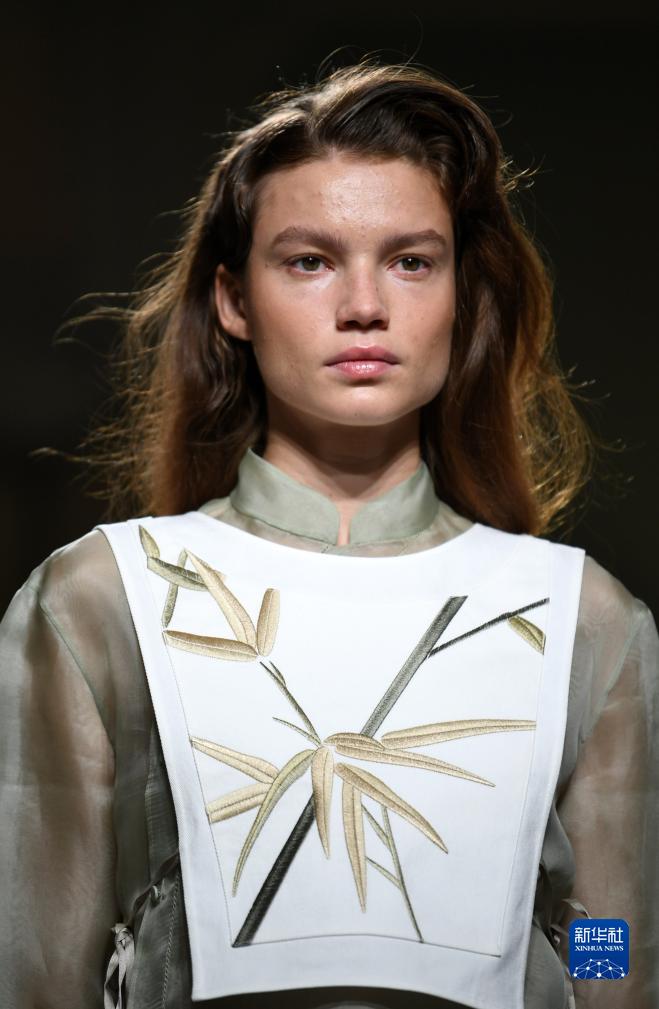 9月24日,模特在意大利米蘭時裝周上展示含有貴州苗繡元素的設計時裝。