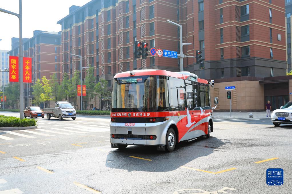 一輛智能網聯巴士在雄安新區容東片區道路上行駛(9月18日攝)。