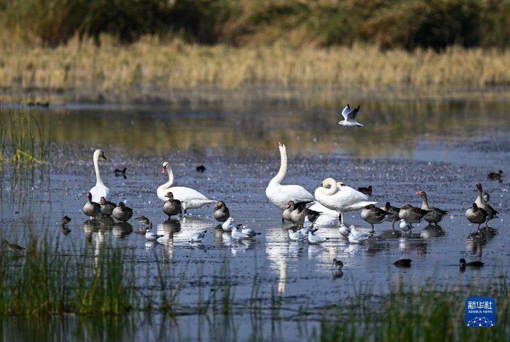 烏梁素海,意為“紅柳湖”,位於黃河“幾字彎”頂部,是黃河流域最大的湖泊濕地。近年來,隨着烏梁素海生態治理力度不斷加大,生態成果也不斷顯現。各類候鳥在這裡安了家,本來前往西伯利亞的疣鼻天鵝也在烏梁素海産卵孵化生活,烏梁素海成為我國最大的疣鼻天鵝繁殖基地。近日,在烏梁素海湖面上,成年疣鼻天鵝帶領幼鳥練習飛翔,準備為過冬前的長途遷徙做準備。