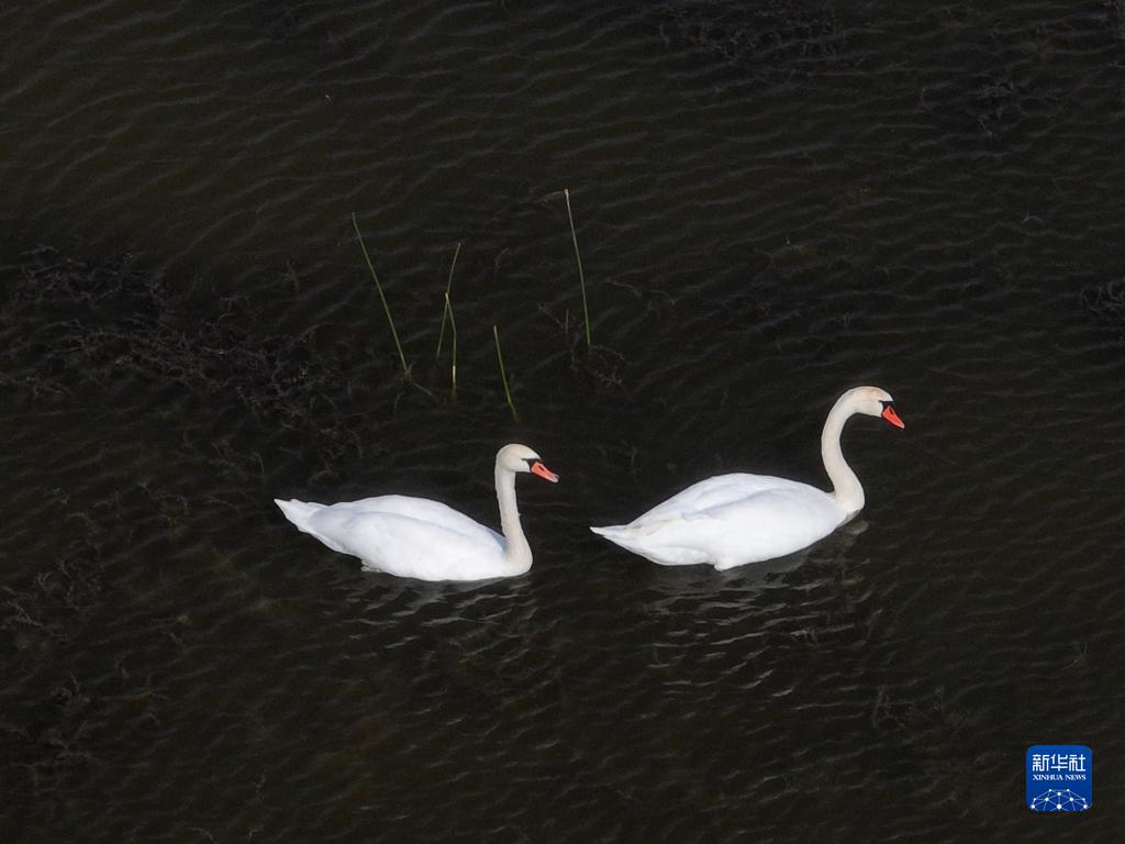 一對疣鼻天鵝在烏梁素海覓食(無人機照片,9月14日攝)。