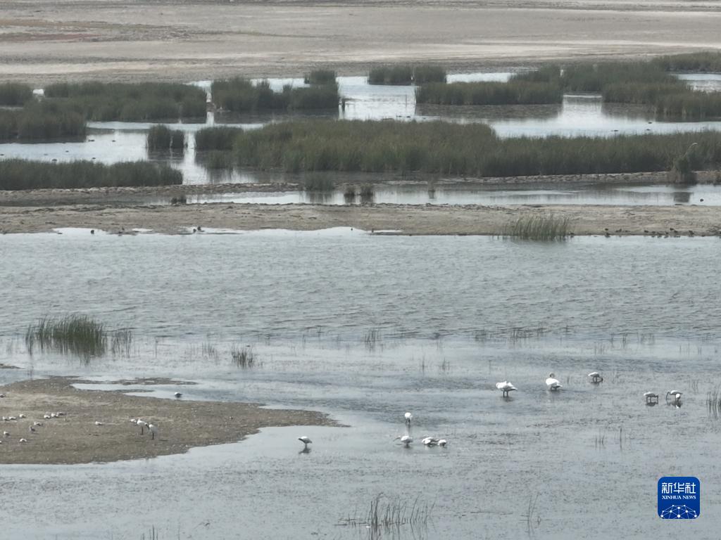 成群的疣鼻天鵝在烏梁素海覓食(無人機照片,9月14日攝)。