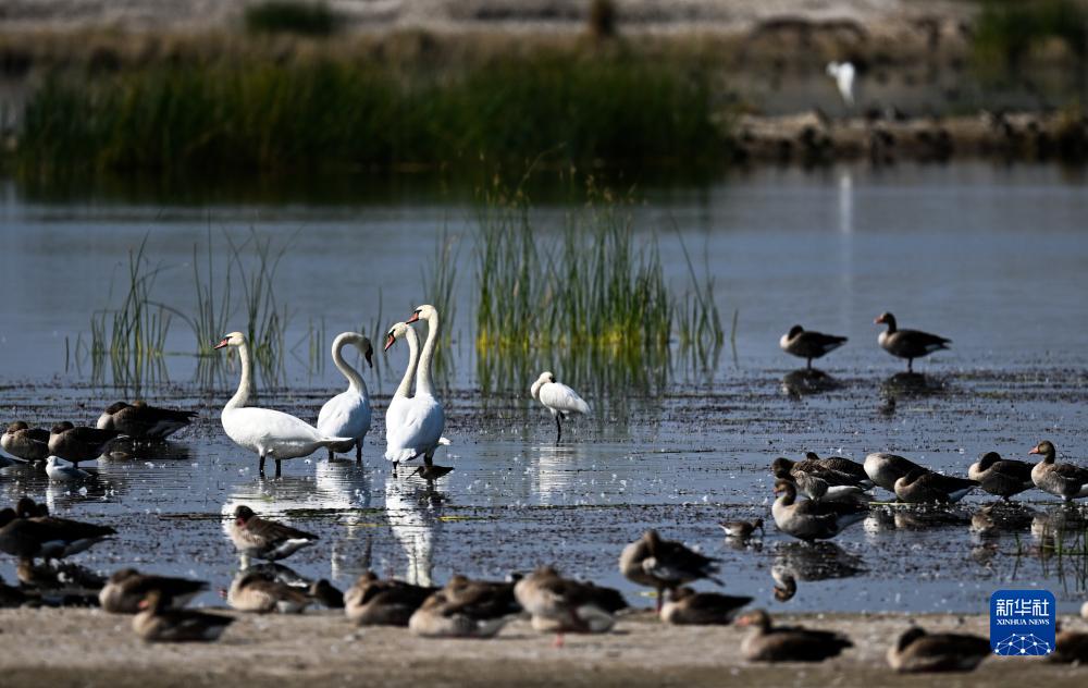 烏梁素海,意為“紅柳湖”,位於黃河“幾字彎”頂部,是黃河流域最大的湖泊濕地。近年來,隨着烏梁素海生態治理力度不斷加大,生態成果也不斷顯現。各類候鳥在這裡安了家,本來前往西伯利亞的疣鼻天鵝也在烏梁素海産卵孵化生活,烏梁素海成為我國最大的疣鼻天鵝繁殖基地。近日,在烏梁素海湖面上,成年疣鼻天鵝帶領幼鳥練習飛翔,準備為過冬前的長途遷徙做準備。