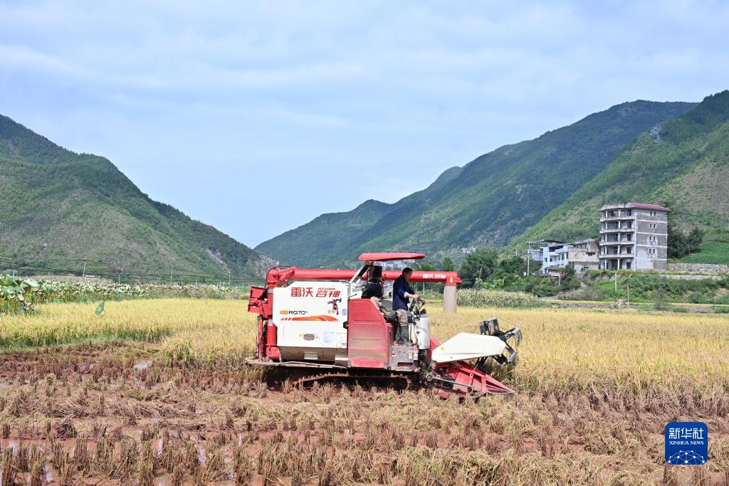 9月25日, 重慶市巫山縣廟宇鎮永安村村民在搶收受災農田裏的水稻。