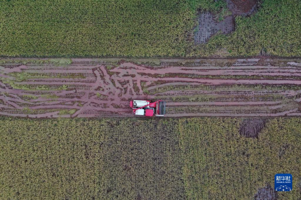 9月25日, 重慶市巫山縣廟宇鎮永安村村民在搶收受災農田裏的水稻(無人機照片)。