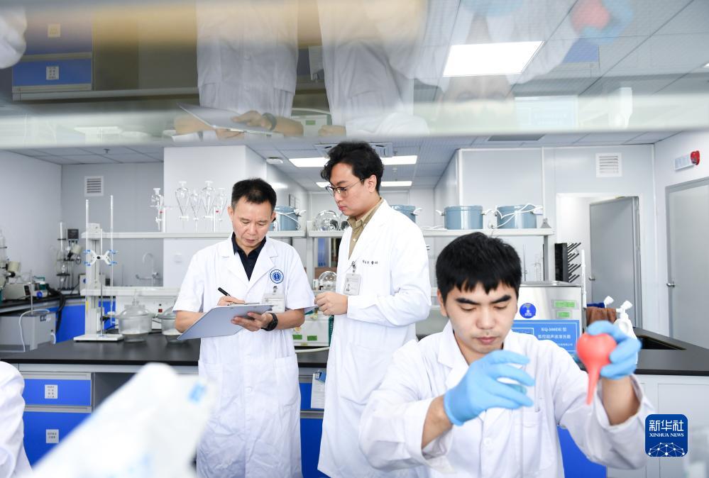 9月4日,郭鈞泯(中)在深圳市中醫藥傳承發展研究院的實驗室與副院長黃濤陽交流。