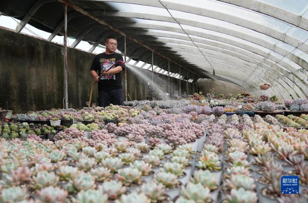 9月25日,秦皇島市海港區海陽鎮栗園村的村民王寶晨在大棚內管護多肉植物。