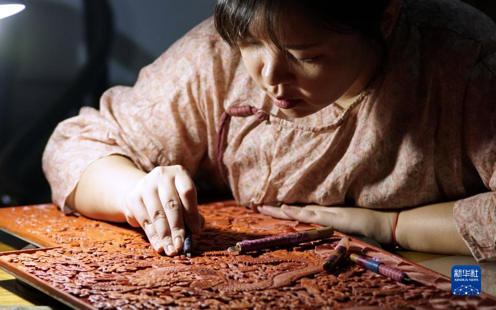海燕在進行大型雕漆作品創作(9月8日攝)。
