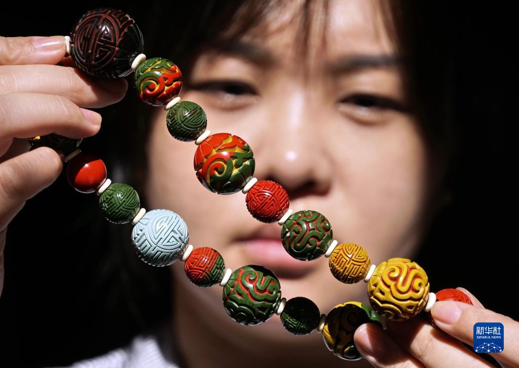 海燕在展示採取新的髹漆技術製作的多色雕漆裝飾球(9月21日攝)。
