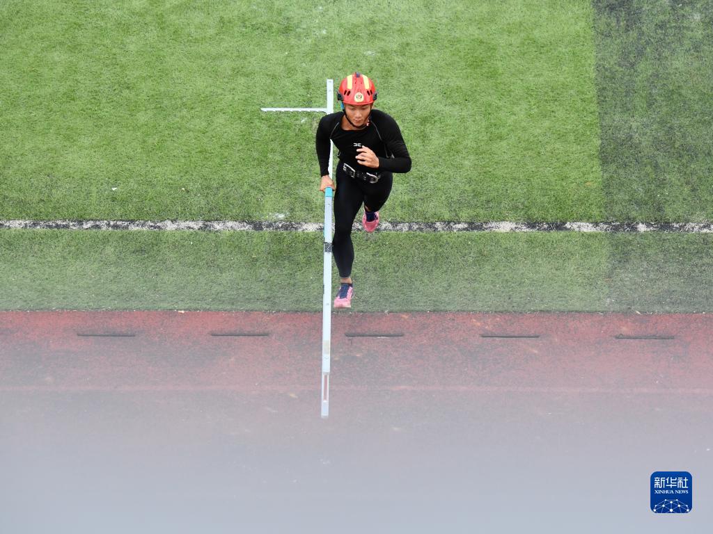 9月26日,參賽選手在進行攀登挂鉤梯比賽。
