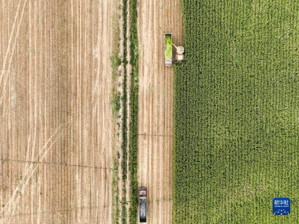 在內蒙古巴彥淖爾市臨河區城關鎮,收割機在收割青儲玉米(無人機照片,9月14日攝)。