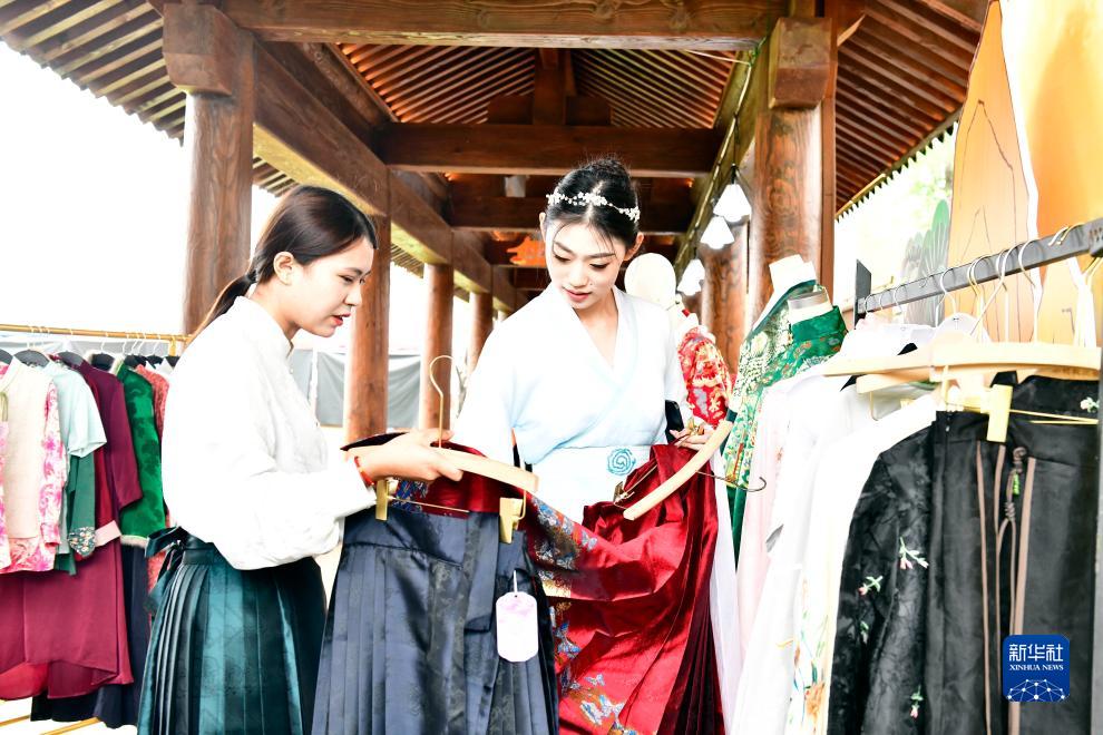 9月26日,在第九屆尼山世界文明論壇“山東手造”精品展區,與會人員在挑選曹縣漢服。