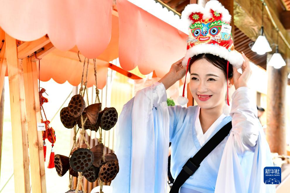 9月26日,在第九屆尼山世界文明論壇“山東手造”精品展區,與會人員在試戴虎頭帽。