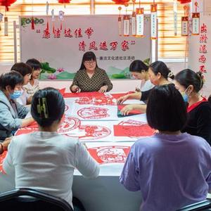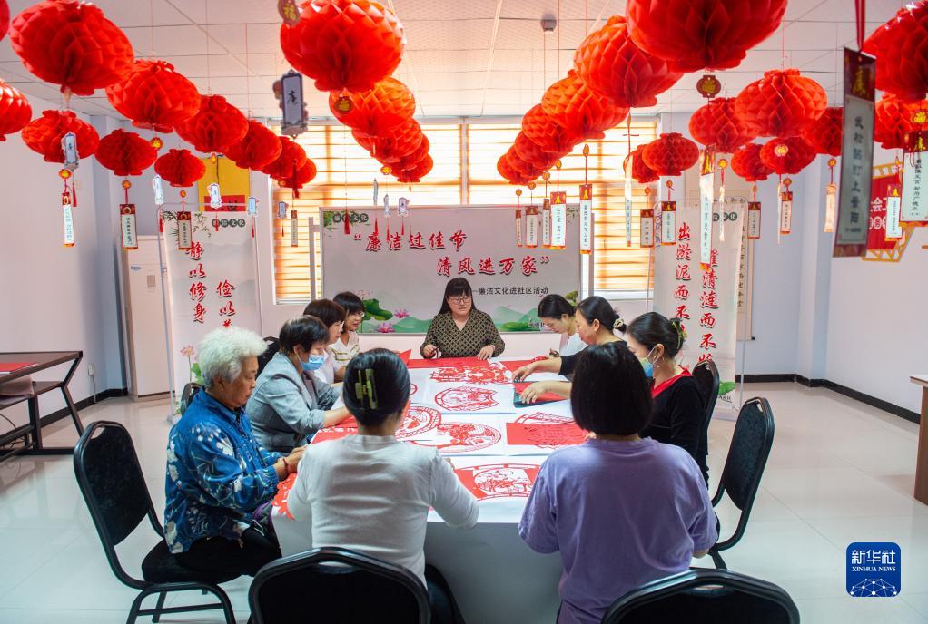 9月26日,在河北省棗強縣河西社區,黨員幹部和居民共同製作廉政剪紙作品。