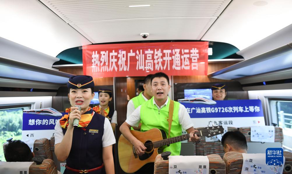 9月26日,鐵路工作人員在廣汕高鐵首發列車上進行文藝表演。