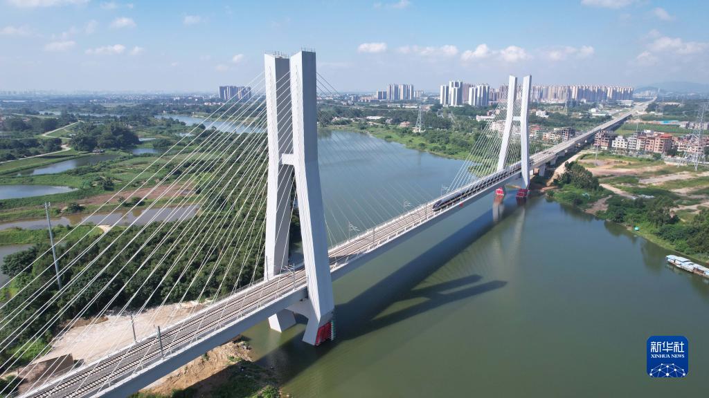 9月26日,列車經過位於廣州市增城區的廣汕高鐵增江特大橋(無人機照片)。