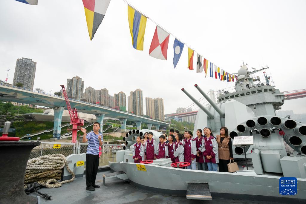 9月26日,在重慶建川海疆博物館展出的我國海軍退役軍艦上,城口縣蓼子鄉第一中心小學的學生、教師代表在體驗鐵路小學愛國主義教育主題課校外活動。