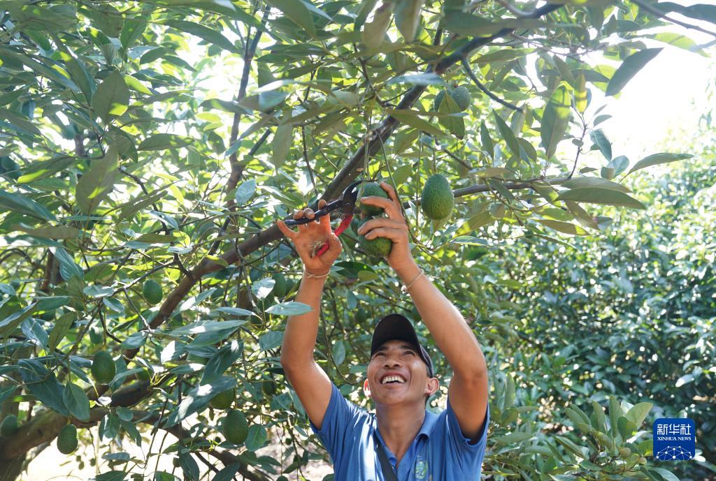 9月26日,在雲南省普洱市孟連傣族拉祜族佤族自治縣娜允鎮牛油果種植基地,村民在採摘牛油果。