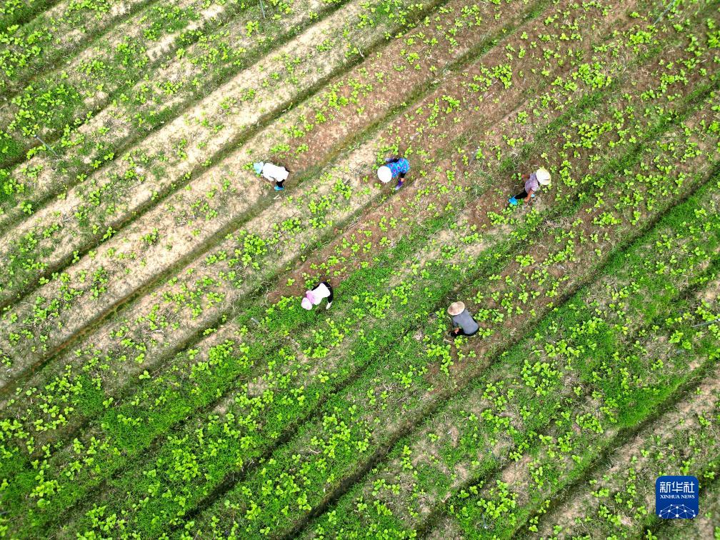 9月26日,村民在貴州省黔東南苗族侗族自治州榕江縣車江壩區蔬菜基地進行田間管理(無人機照片)。