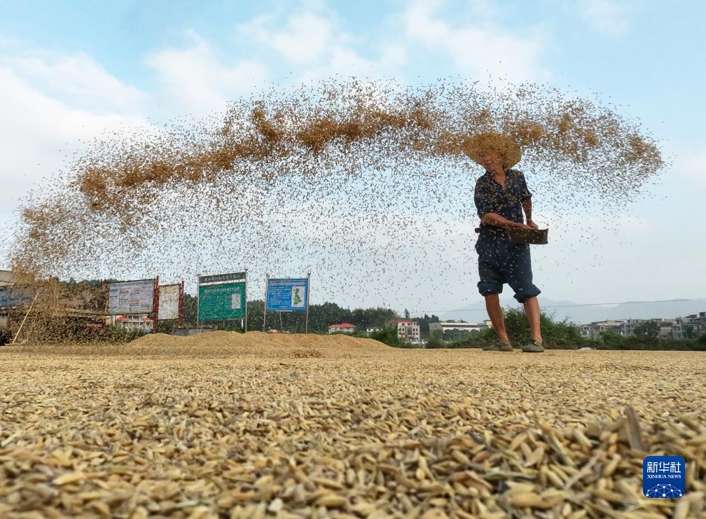9月25日,湖南省衡陽市衡陽縣關市鎮的農民在晾曬稻穀。