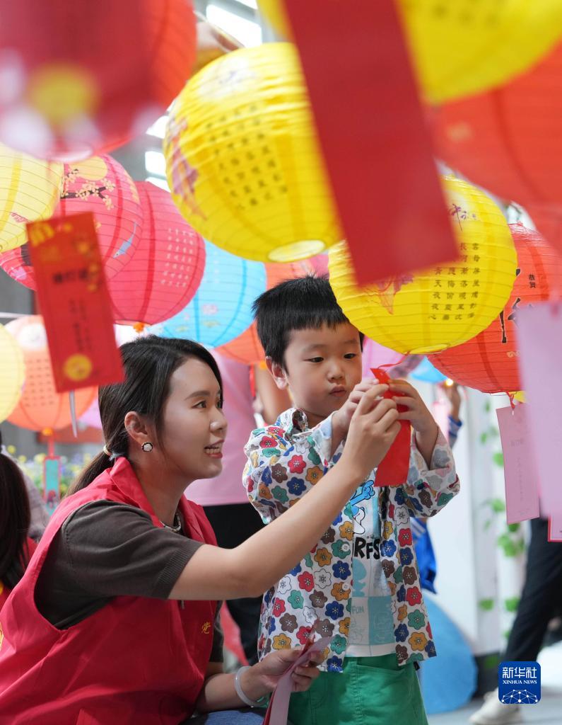 9月26日,在重慶市北碚區澄江鎮新時代文明實踐站,志願者和小朋友一起猜燈謎。