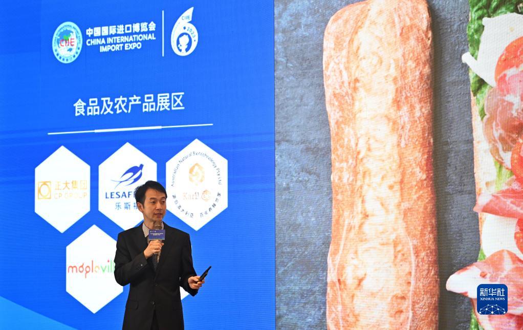 9月26日,工作人員在活動現場介紹第六屆進博會食品展區。