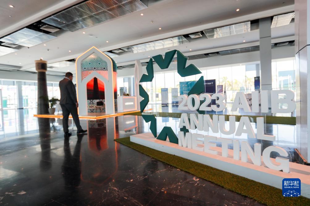 9月26日,在埃及沙姆沙伊赫,參會者走過亞投行第八屆理事會年會的展板。