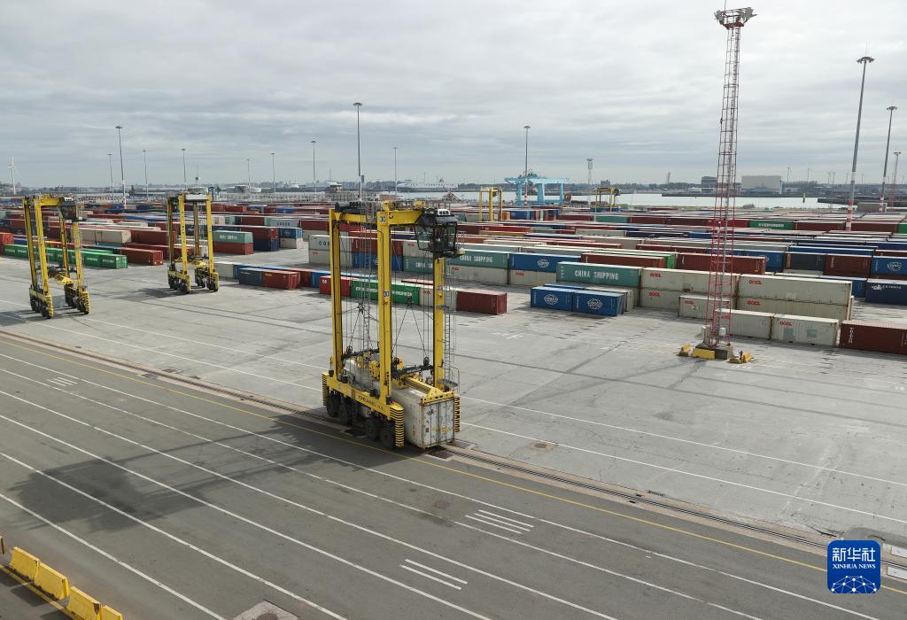 9月25日,在比利時安特衛普-布魯日港中遠海運(港口)澤布呂赫碼頭,工人駕駛跨運車作業。