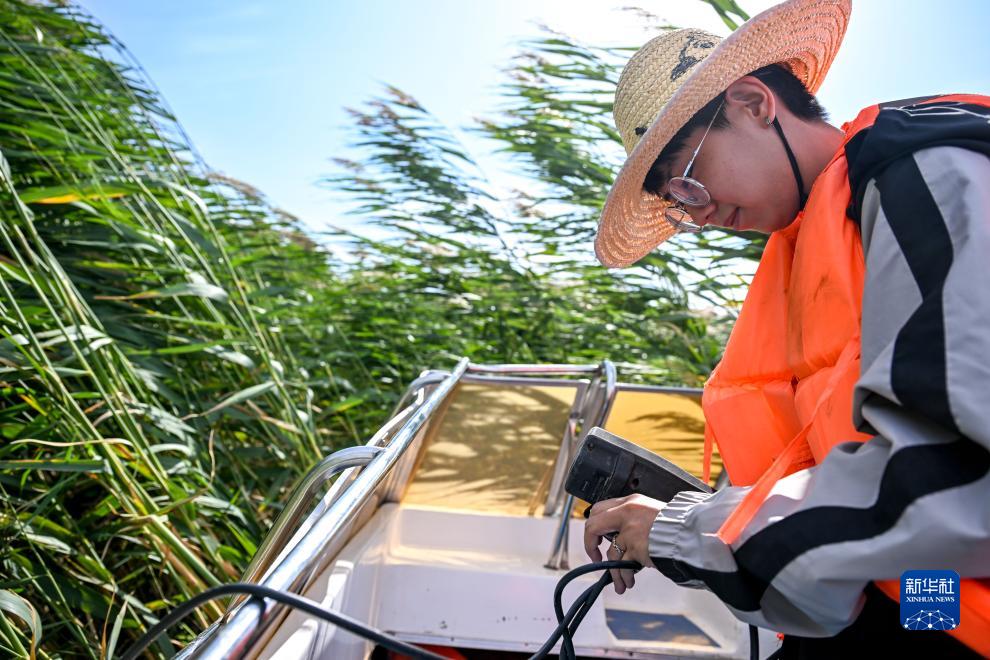 9月15日,在烏梁素海湖面上,武蓉測量水質。