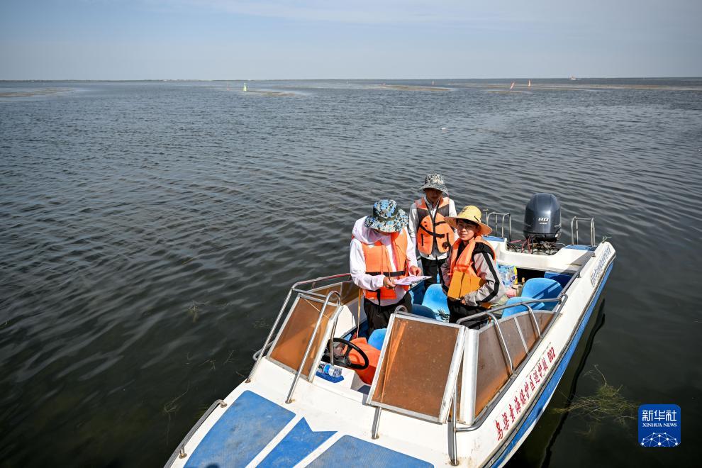 9月15日,在烏梁素海湖面上,武蓉(右一)、馮琛(左一)和劉瑩慧準備乘坐快艇去採集湖水樣本。