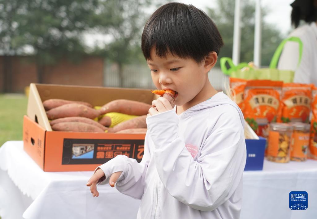 9月27日,一名小朋友在夏各莊鎮第五屆紅薯文化節現場品嘗紅薯。