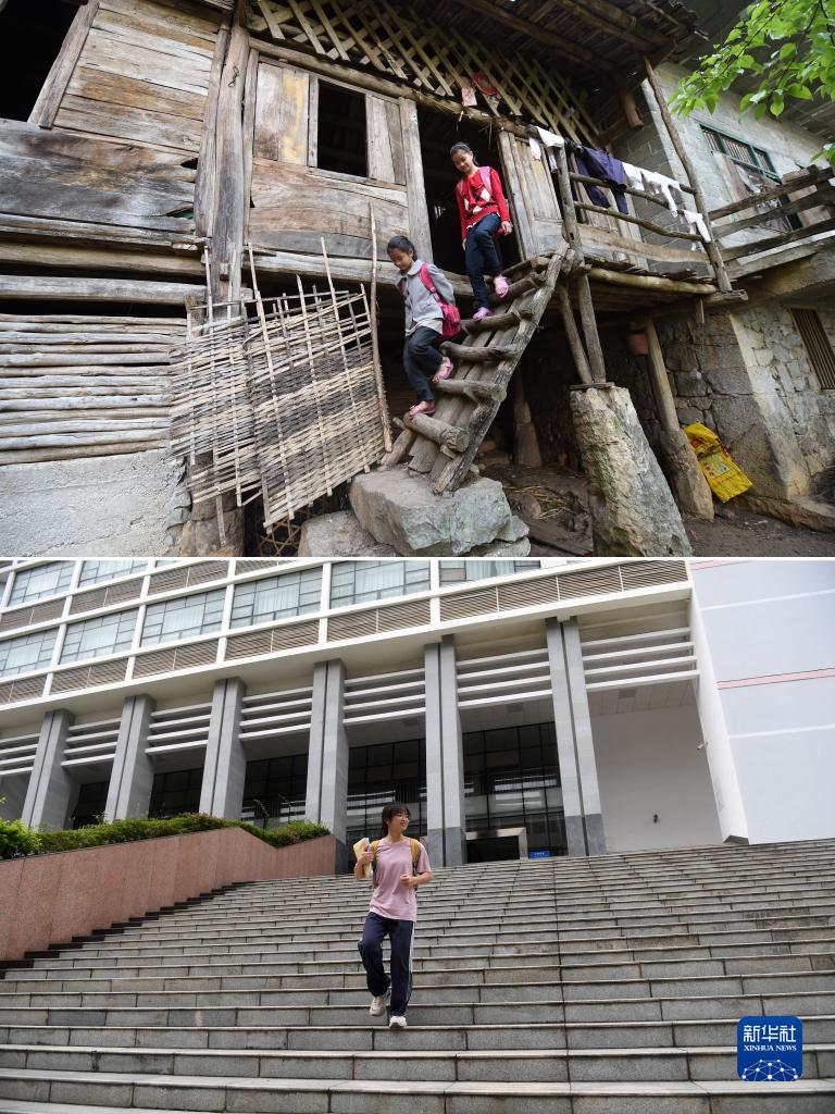 這是一張拼版照片,上圖為:在廣西都安瑤族自治縣拉烈鎮崇業村弄後屯,藍曉萍(後)和妹妹藍雲萍走出家門去上學(2015年4月14日攝);下圖為:在廣西南寧師範大學,藍曉萍走出學校圖書館(2023年9月26日攝)。
