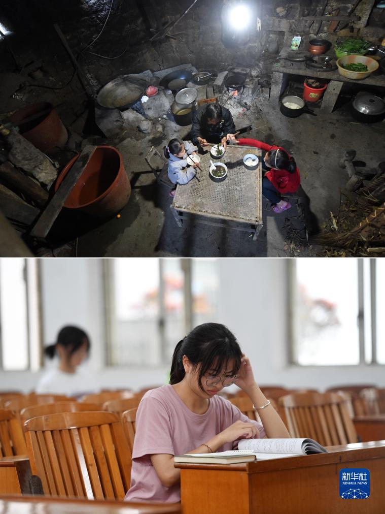 這是一張拼版照片,上圖為:在廣西都安瑤族自治縣拉烈鎮崇業村弄後屯,藍曉萍(右)和妹妹藍雲萍(左)、父親藍啟站在吃早飯(2015年4月14日攝);下圖為:在廣西南寧師範大學,藍曉萍在教室裏學習(2023年9月26日攝)。