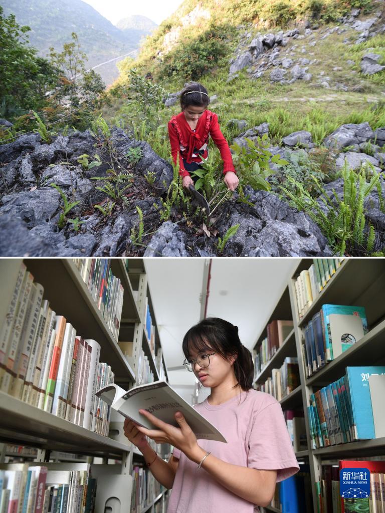 這是一張拼版照片,上圖為:在廣西都安瑤族自治縣拉烈鎮崇業村弄後屯,藍曉萍放學回家後在山上一邊放羊一邊砍柴(2015年4月14日攝);下圖為:在廣西南寧師範大學,藍曉萍在圖書館裏看書(2023年9月26日攝)。