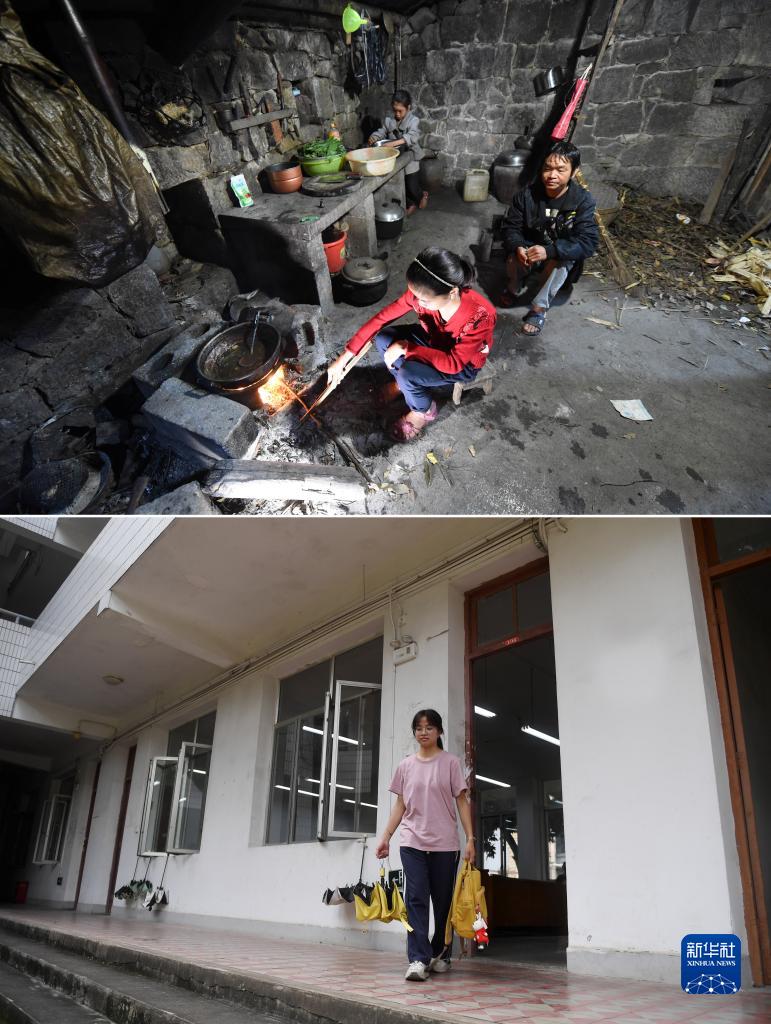 這是一張拼版照片,上圖為:在廣西都安瑤族自治縣拉烈鎮崇業村弄後屯,藍曉萍(前)在為父親和妹妹準備早飯(2015年4月14日攝);下圖為:在廣西南寧師範大學,藍曉萍走出教室(2023年9月26日攝)。