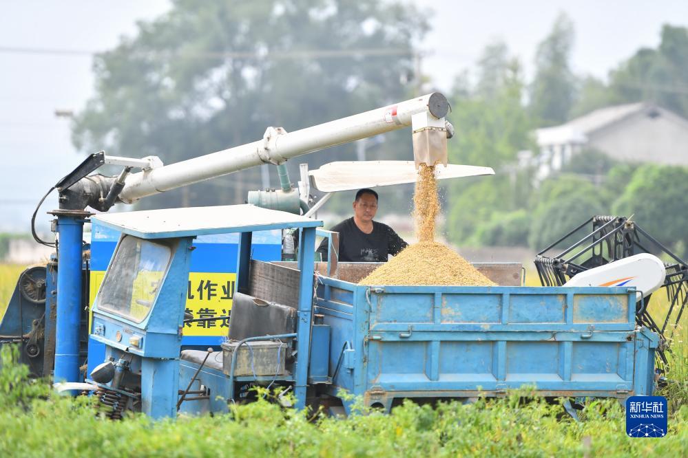 金秋時節,湖南省瀏陽市沿溪鎮種植的中稻迎來收穫季,當地農民搶抓農時收割水稻,稻田裏一派繁忙景象。