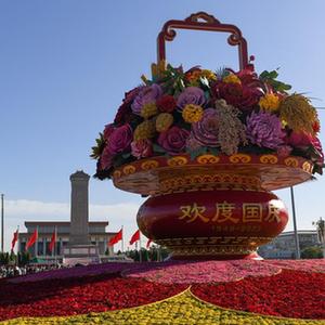 中秋及國慶節假期臨近,北京天安門廣場上的“祝福祖國”巨型花籃吸引着眾多市民游客參觀游覽。