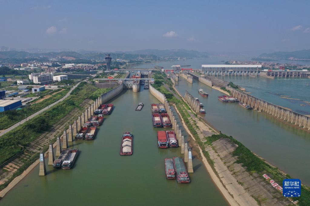 船舶通過西江廣西梧州長洲水利樞紐船閘(無人機照片,9月27日攝)。
