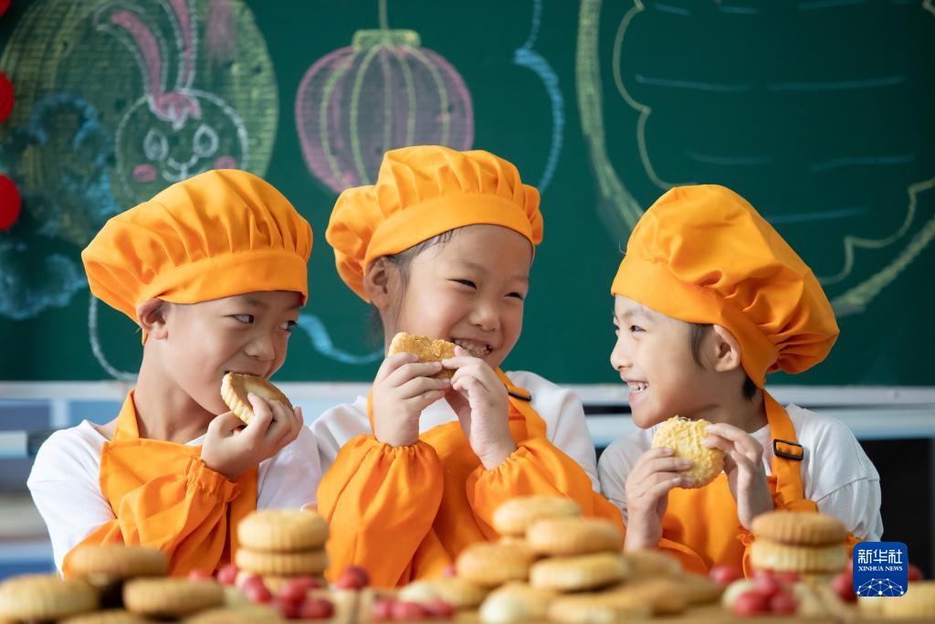 9月27日,河北省邯鄲市肥鄉區肥鄉鎮第二幼兒園的小朋友在品嘗自己親手製作的月餅。
