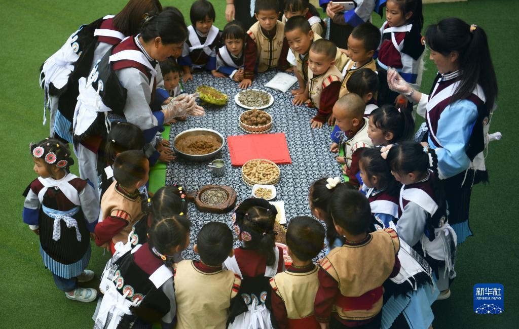 9月27日,雲南省麗江師範高等專科學校附屬新苗幼兒園的小朋友在老師的指導下製作月餅。