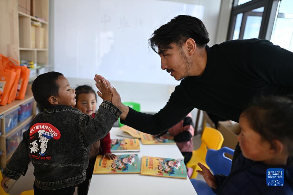 在青海省玉樹藏族自治州曲麻萊縣秋智鄉布甫村陽光幼兒園,秋智鄉幼兒園副園長才仁戰鬥(右二)在課堂上和小朋友互動(9月14日攝)。