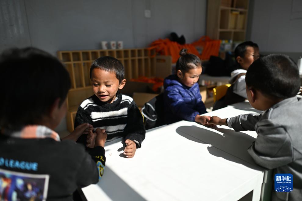 在青海省玉樹藏族自治州曲麻萊縣秋智鄉布甫村陽光幼兒園,普松東周(左二)和夥伴們在教室內玩耍(9月14日攝)。