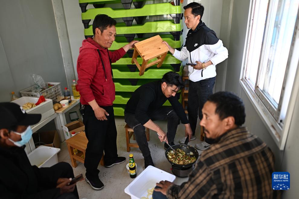 在青海省玉樹藏族自治州曲麻萊縣秋智鄉布甫村陽光幼兒園,秋智鄉幼兒園副園長才仁戰鬥(左三)在板房內為孩子們準備午餐(9月14日攝)。