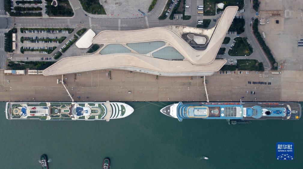 9月27日,天津東方國際郵輪有限公司旗下“夢想”號郵輪(左)、中國船舶集團旗下愛達郵輪“地中海”號郵輪靠泊在天津國際郵輪母港準備啟航(無人機照片)。