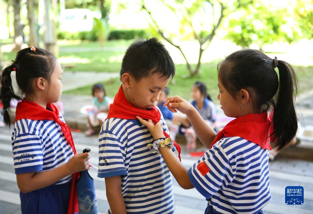 9月27日,海南省三沙市永興學校的少先隊員們在“童心向祖國,我為祖國獻首歌”活動中佩戴紅領巾。