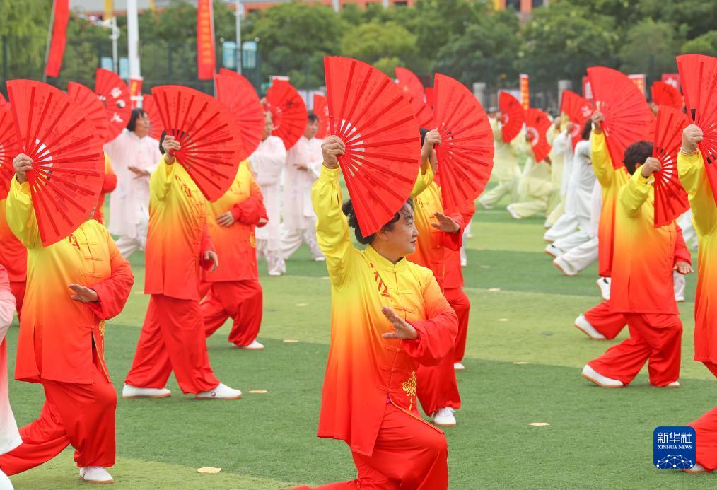 9月27日,人們參加河北省蔚縣“迎國慶 慶中秋”千人太極集中展演活動。