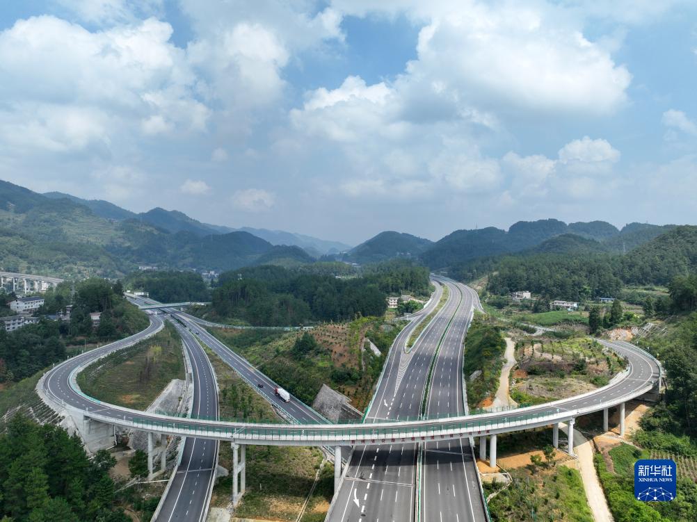9月28日,在貴州省遵義市境內拍攝的蘭海高速重遵擴容工程新蒲樞紐互通(無人機全景照片)。