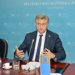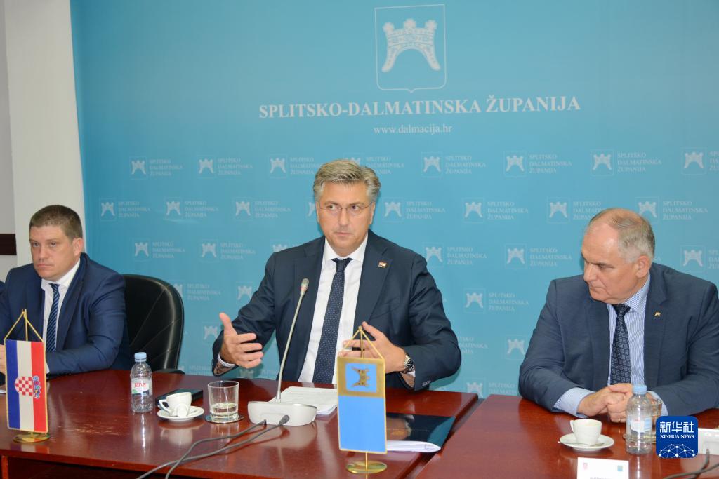 9月27日,克羅地亞總理普連科維奇(中)在斯普利特舉行的武切維察道路連接線項目簽約儀式上致辭。