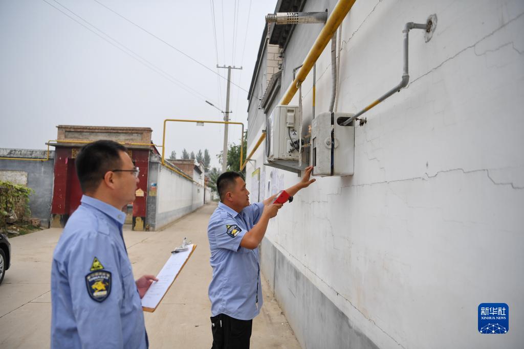 9月27日,工作人員在遭受洪水影響的河北保定高碑店市潘家營村查驗燃氣設備運行情況。