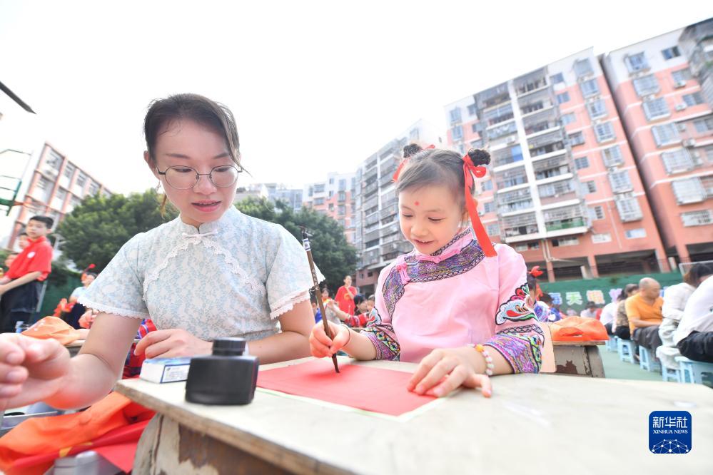 9月28日,梧州市龍圩區龍圩中心小學一年級新生在開筆禮儀式上用毛筆寫“人”字。